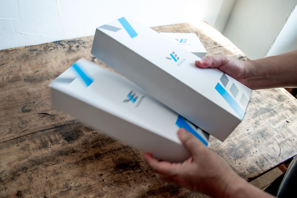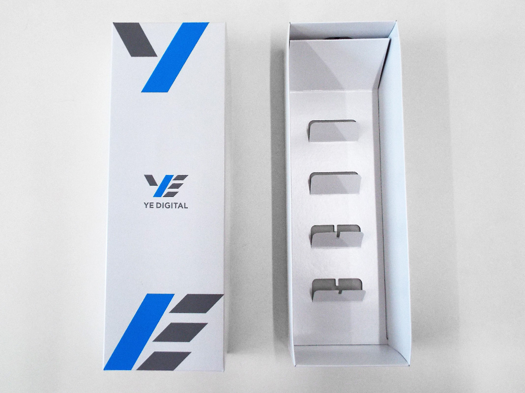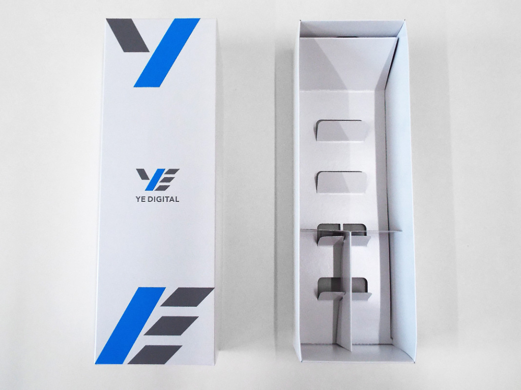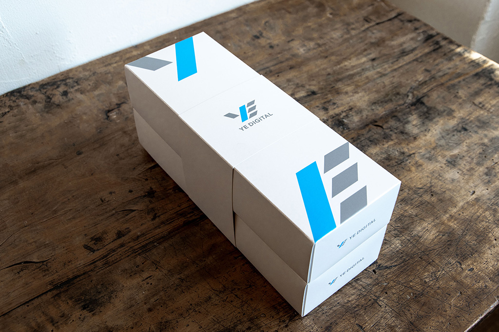最終的に完成した箱は、YEデジタル様の社風とビジュアルイメージにぴったりの、シンプルで洗練された仕上がり。スリーブでまとめられた2段重ねのスタイルは、贈答時の見映えも良く、実用性も抜群。箱を受け取った方からも「品がある」「社名入りでも控えめで上品」「中身の安定感がすごい」と高く評価されました。