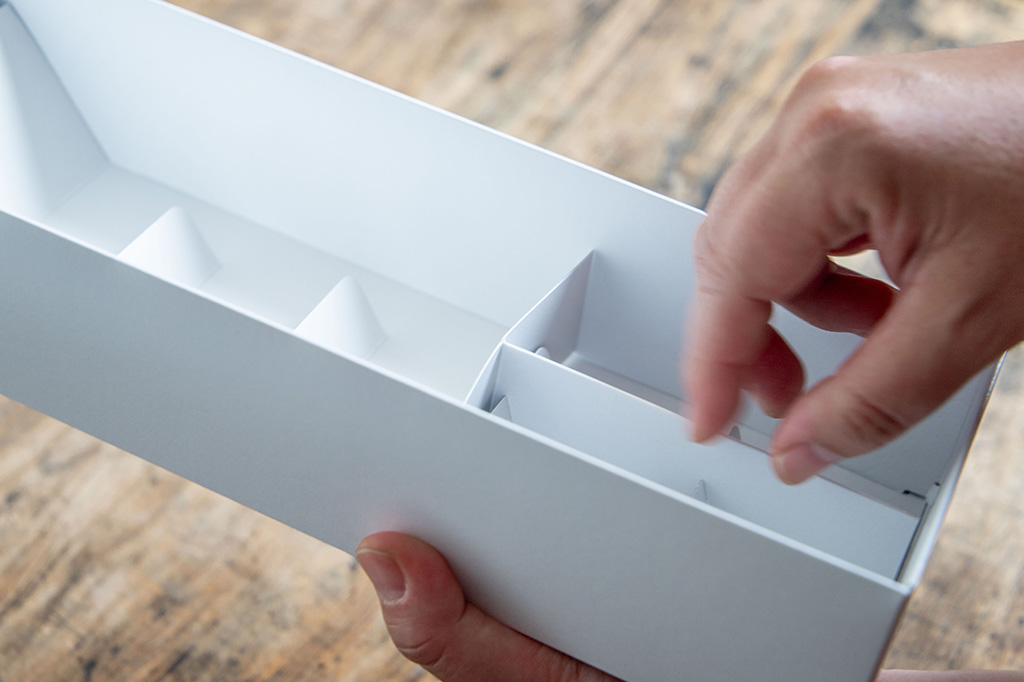 通常、箱の仕切りは固定構造であることが多く、内容物に合わせて箱ごとサイズを変えるのが一般的です。ですがそれでは、在庫管理もコストも手間がかかるし、なにより「お客様の使い勝手」が犠牲になる。そこでS氏は、5個でも7個でも美しく、しかも安定して収まる“可変仕切り”の設計に挑戦することを決意しました。