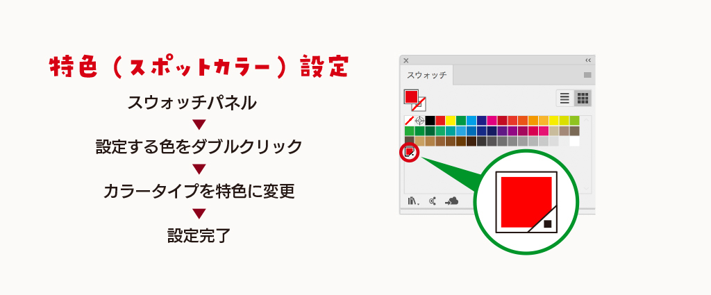 Illustratorなどのデータ上で特色(スポットカラー)として正しく設定することはとても大事なことです。そうしておかないと印刷時に勝手にCMYKに変換されてしまうことがあります。