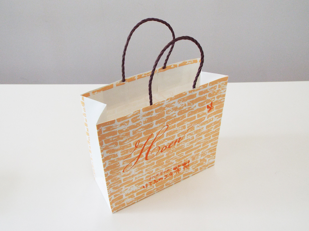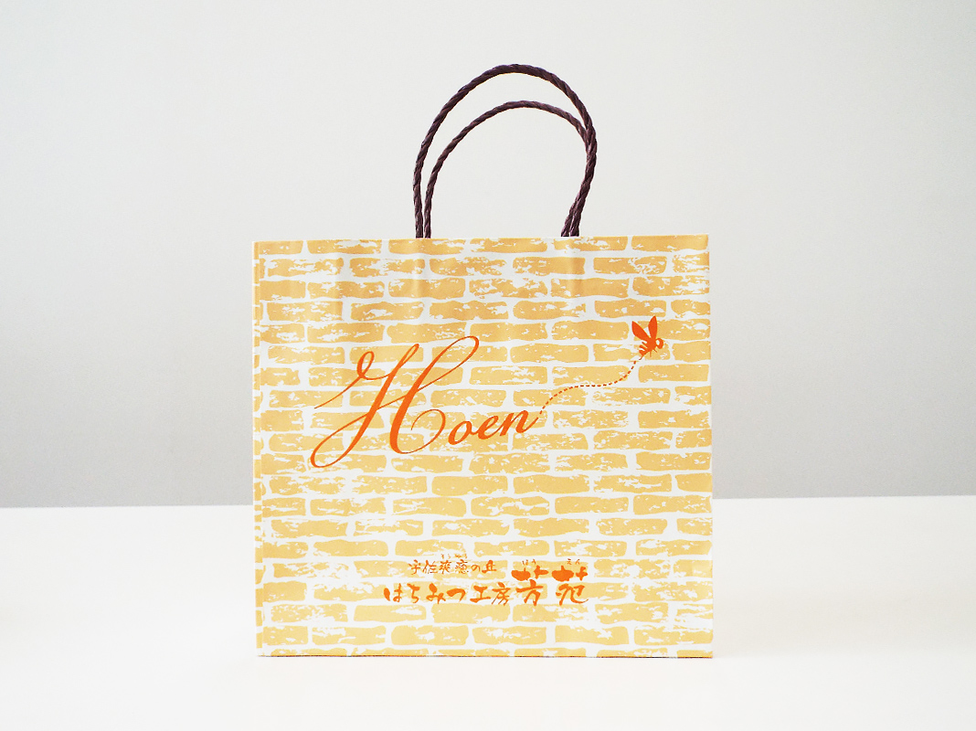 お店の雰囲気にぴったりで、レンガ柄が温かく、ミツバチのワンポイントが可愛らしくて、お客様にも好評です。オレンジ1色なのにとても表情があり、印象に残る仕上がりになりました。手に取った方の気持ちが明るくなるような紙袋です。
